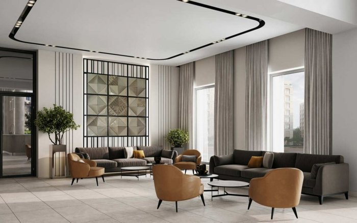 Арт-объекты интегрированы в общественные пространства, создавая атмосферу галереи и подчеркивая статус клубного дома.